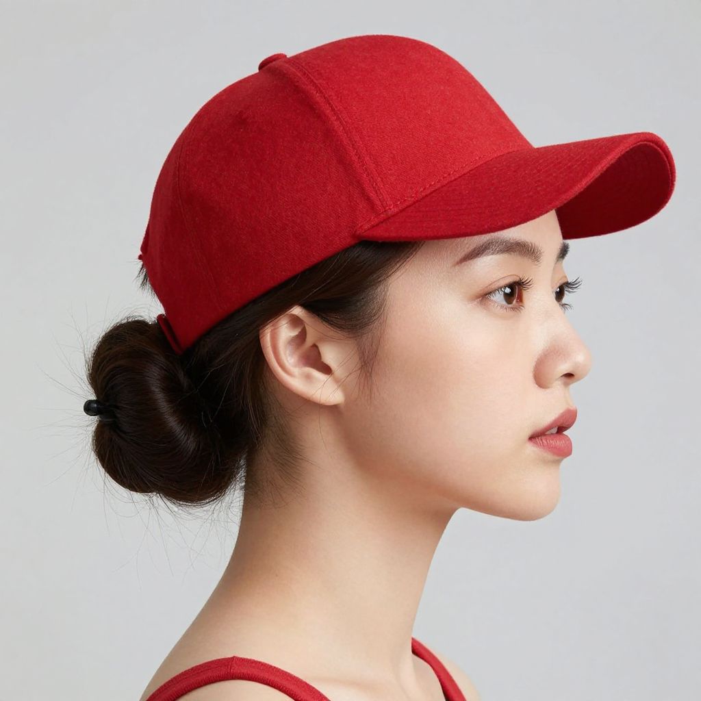 A woman with a red hat and a bun hairstyle, looking to the side.