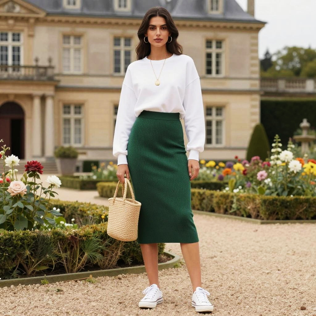 A woman, in a studio pierrot style, wearing a white crew neck sweatshirt tucked into a high-waisted ribbed forest green midi skirt, paired with white low-top sneakers and a straw handbag. She stands in a flower garden near a historical mansion, adorned with a gold pendant necklace and hoop earrings, her hair styled down. Sexy. Pretty face and beutiful eyes