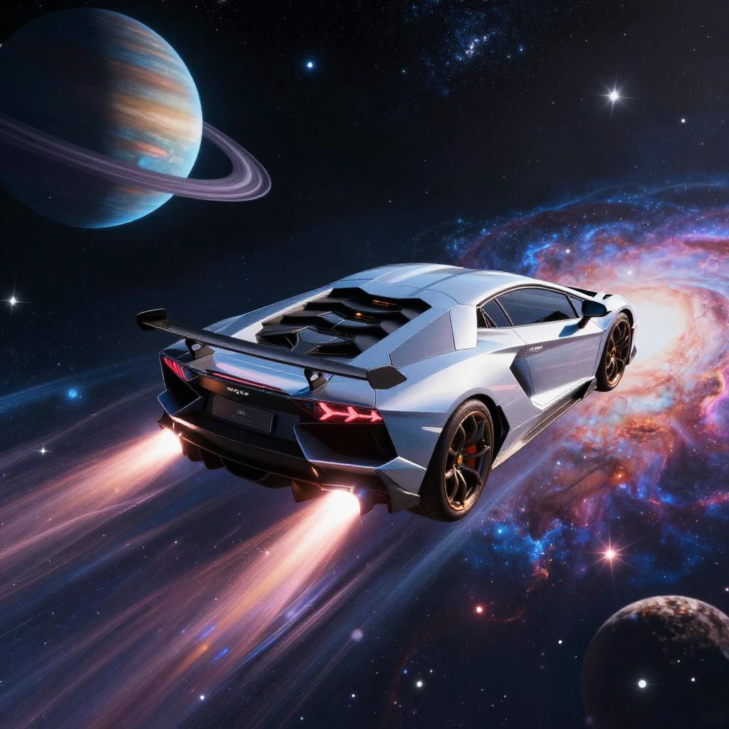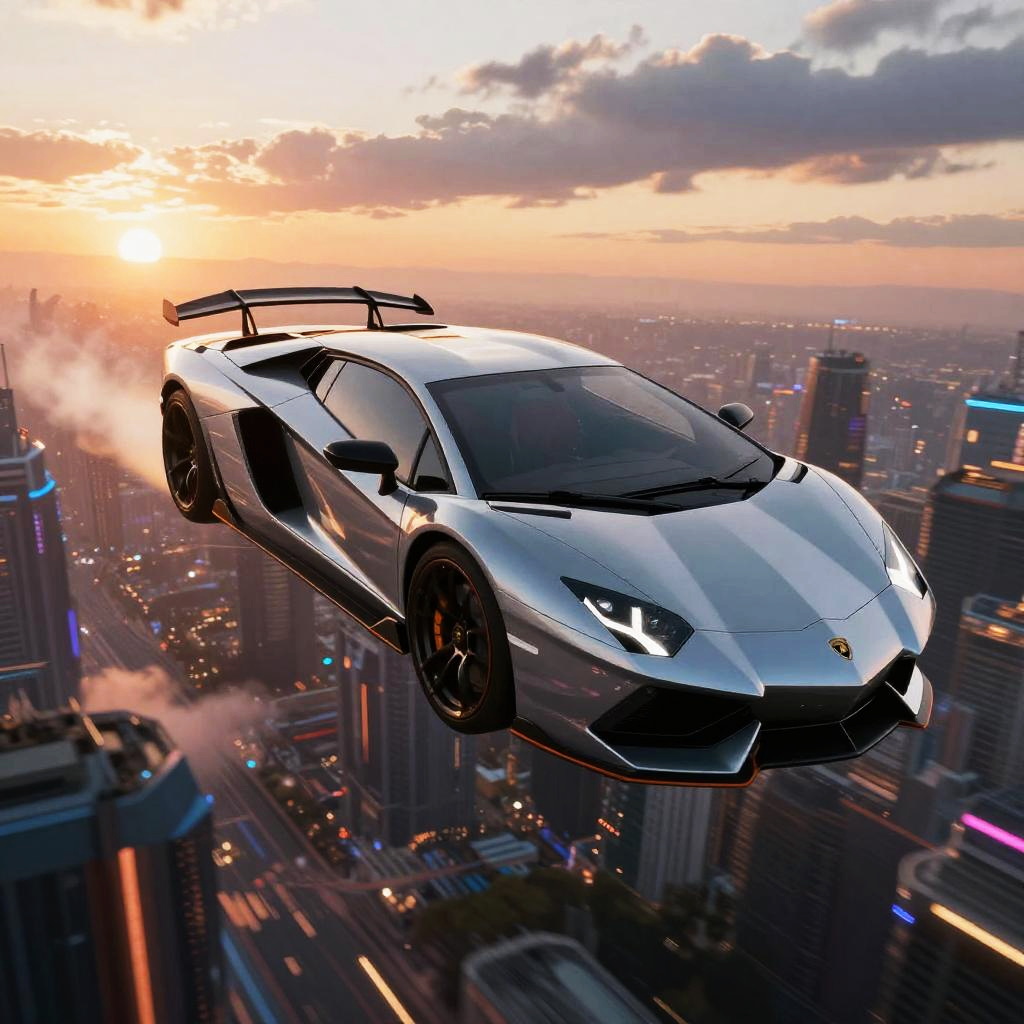 Lamborghini flying in a stormy sky, lightning illuminating glossy car body, dynamic motion blur, dark clouds, intense atmosphere, ultra-detailed, concept art style