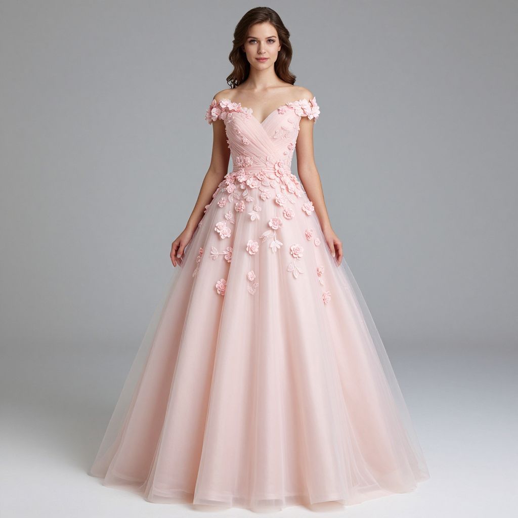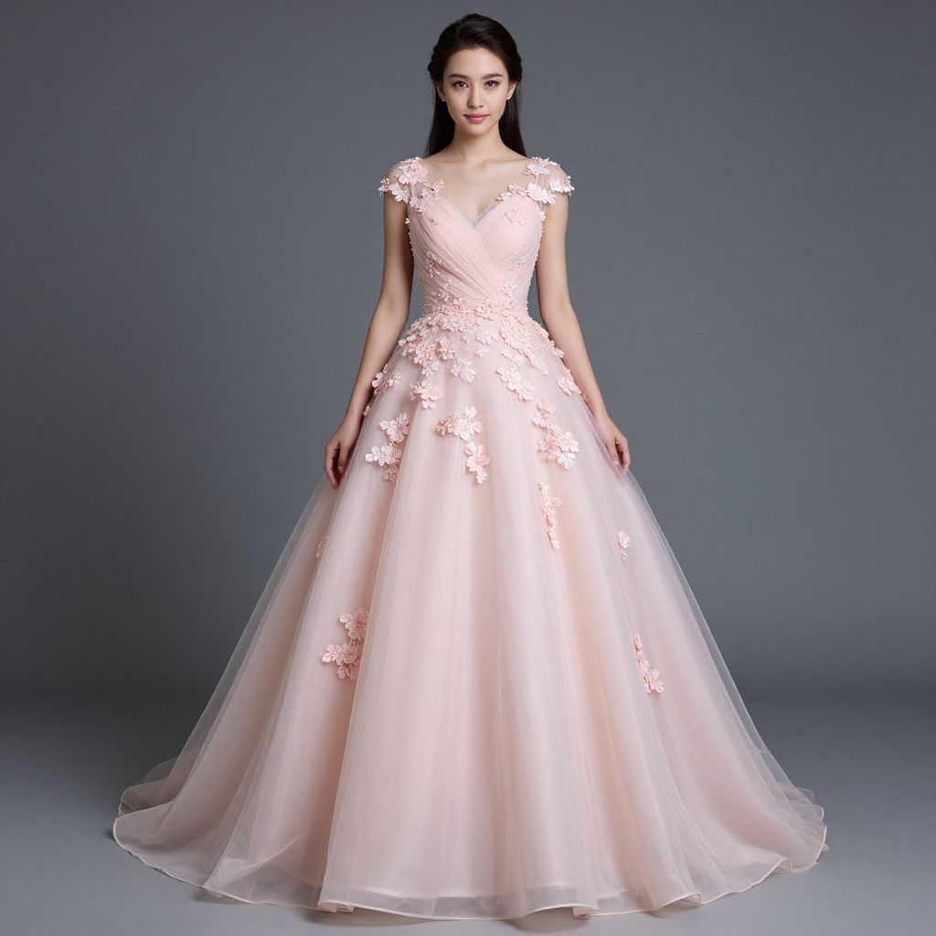 Photograph of a young woman with long black hair, fair skin, and a slender build, standing against a gradient gray background. She wears a floor-length, pale pink, ball gown with a fitted bodice and a wide, flared skirt. The dress features delicate, pink floral appliqués scattered across the bodice and skirt, with short, sheer cap sleeves. The fabric is a combination of satin and tulle, giving a soft and elegant texture. She stands with a slight smile, her hands resting by her sides, and the dress has a subtle, V-shaped neckline.
