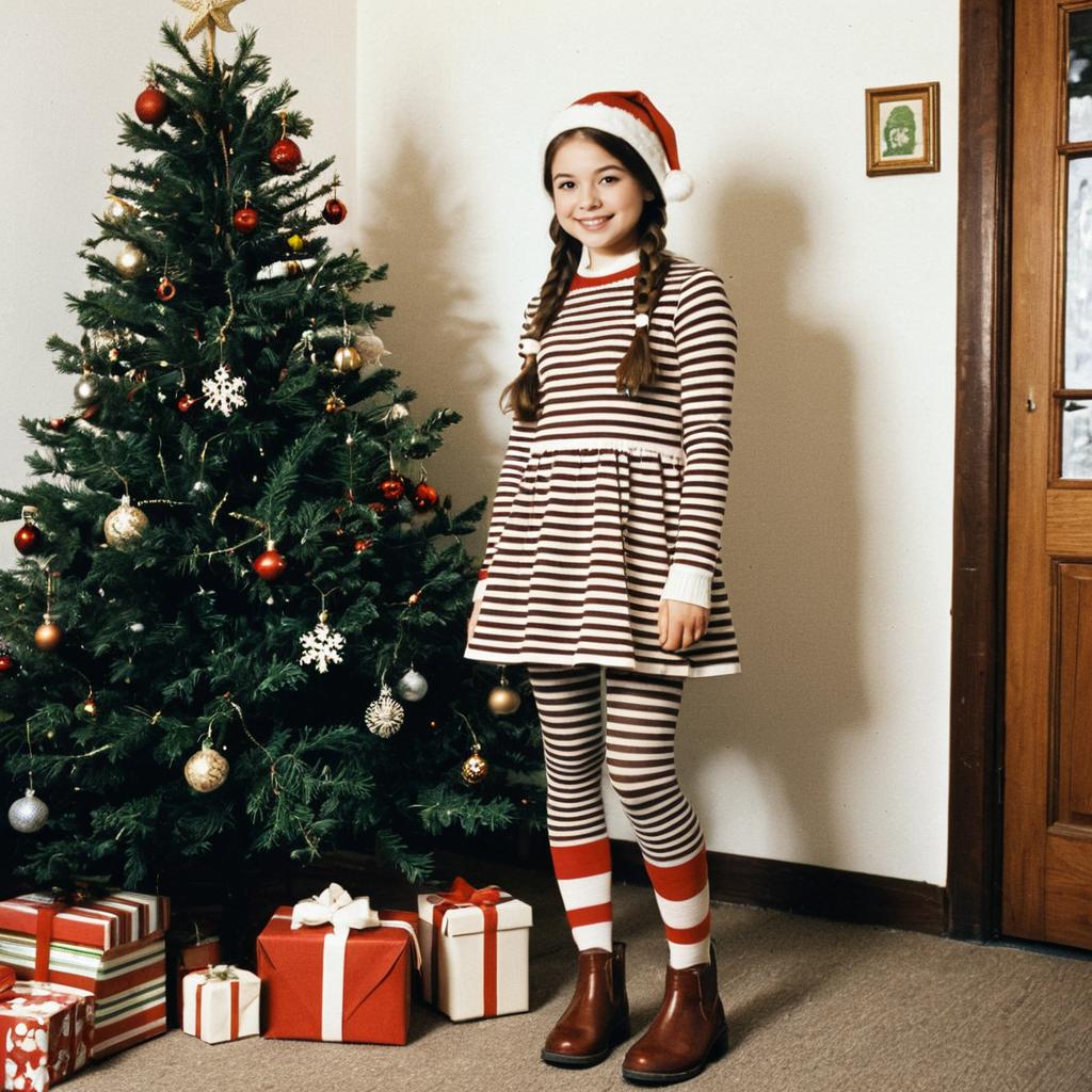 Girl storybook christmas,1girl,solo,hat,christmas,braid,striped clothes,dress,pantyhose,long sleeves,christmas tree,long hair,full body,boots,brown hair,standing,looking at viewer,striped socks,striped pantyhose,brown footwear,smile