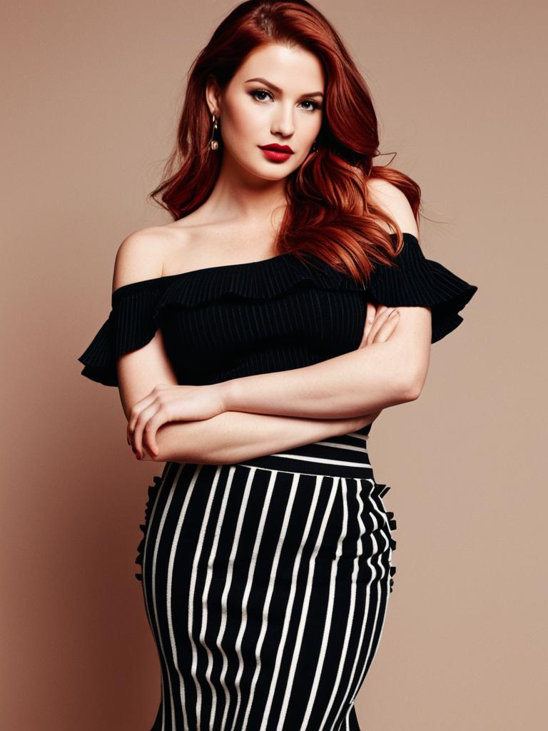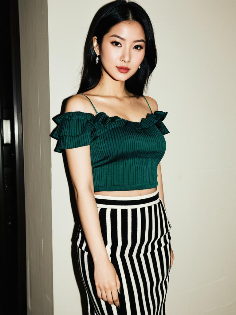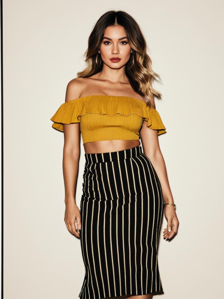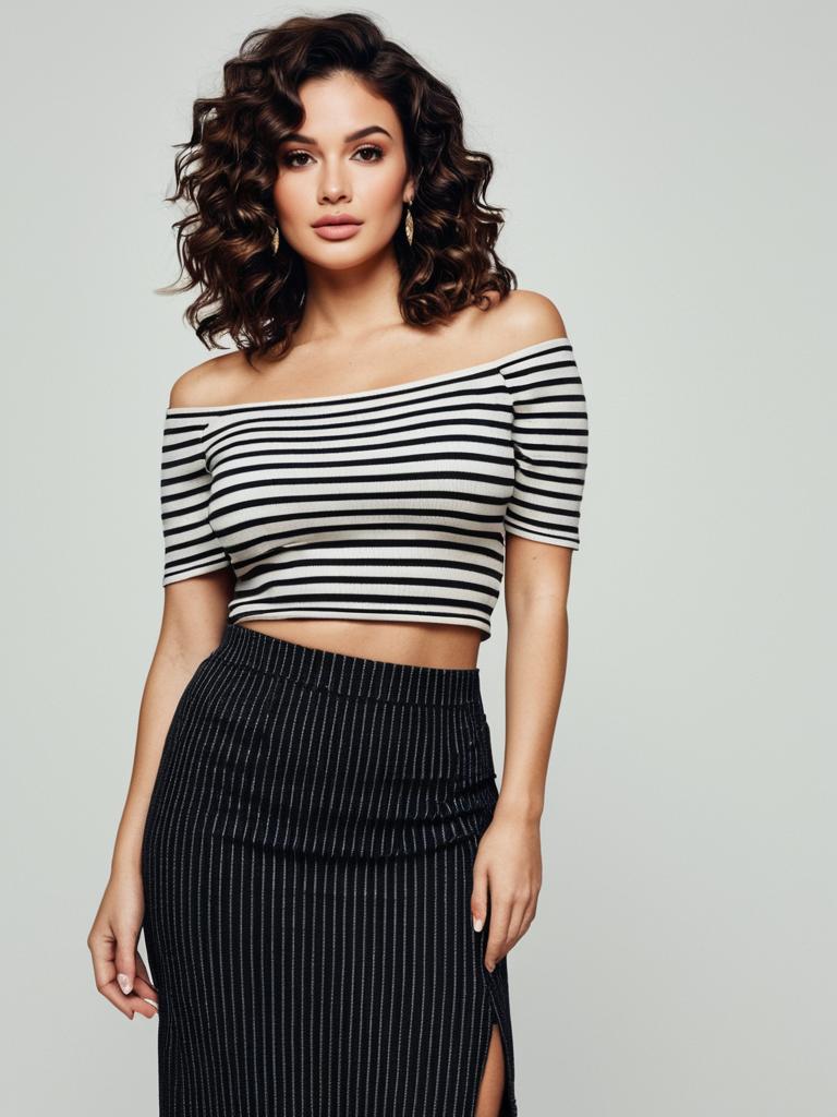 Woman in Off-Shoulder Crop Top and Stripe Midi Skirt