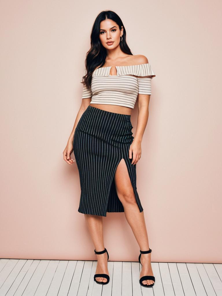 Big breasted woman wearing off-the-shoulder ruffled ribbed crop top and high-waisted vertical stripe midi pencil skirt with front slit in soft blush pink top with narrow black-and-white pinstripe skirt on freckled woman with straight hair and soft peachy makeup posed standing with one foot slightly forward and arms at her sides in cream-colored wall reminiscent of indoor party setting, cool white lighting evoking indoor club atmosphere, trendy night-out fashion photography, high resolution, ultra-detailed