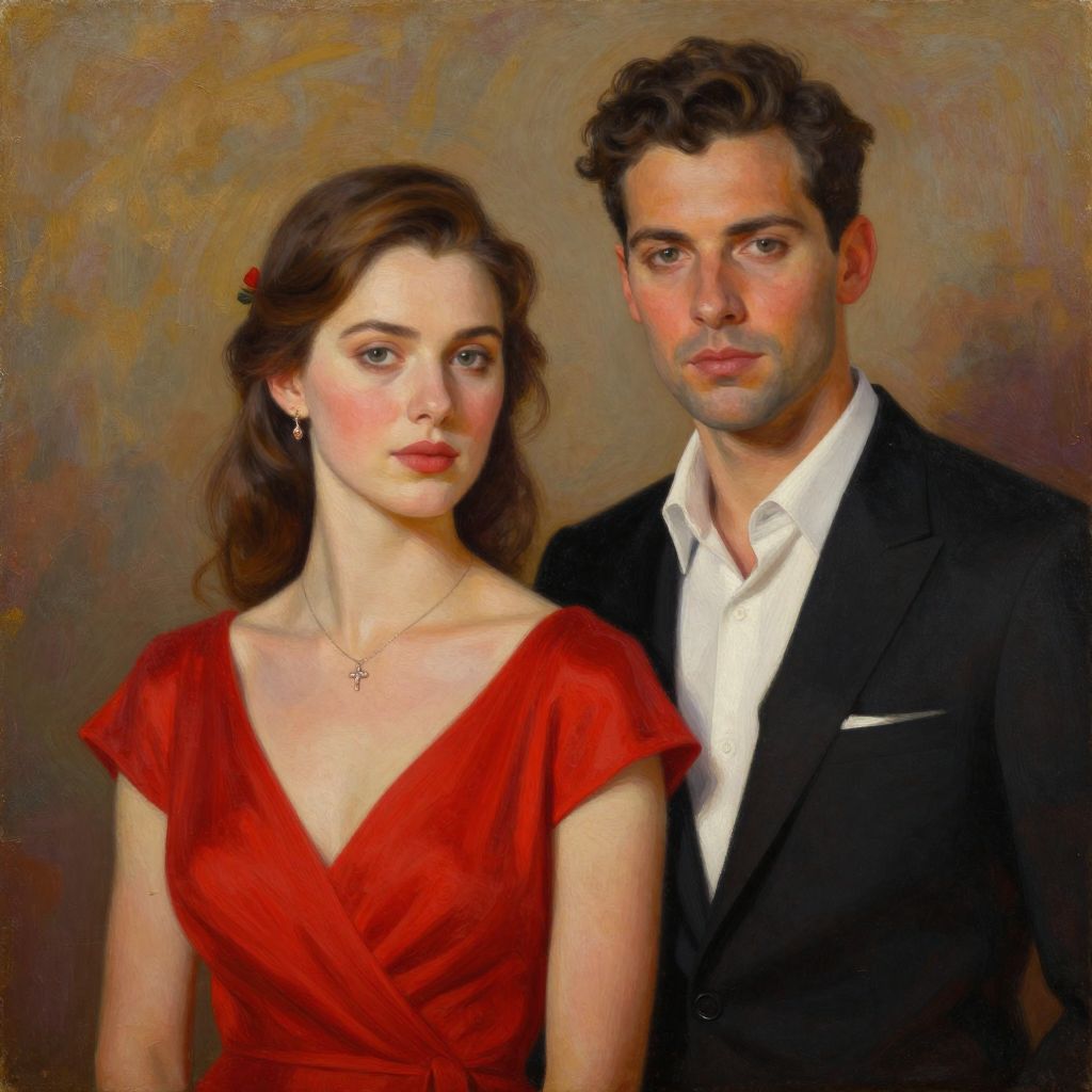 Elegant custom oil painting depicts a man and woman dressed in sophisticated attire, with the woman wearing a vibrant red dress and a delicate necklace, while the man is clad in a sharp black suit and white shirt, both positioned closely against a warm, textured background.