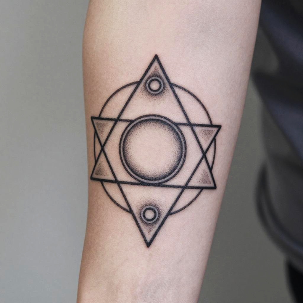 Geometric balance tattoo design with interlocking triangles and circles, precise dot work and clean lines, highlighting symmetry and contrast on the forearm, inspired by sacred geometry and contemporary tattoo aesthetics, rendered in monochrome.