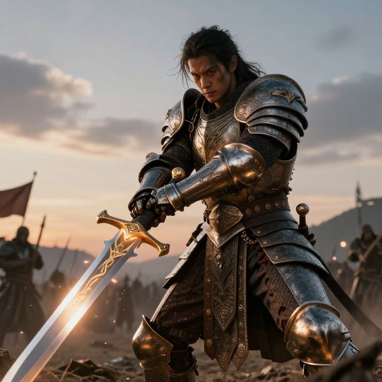 Stronger warrior clad in ornate armor, holding a glowing sword in a battlefield at dusk, embodying courage and determination, detailed textures and dynamic lighting, high fantasy epic scene.