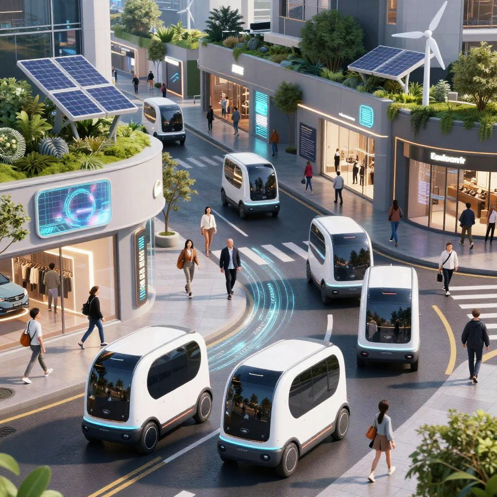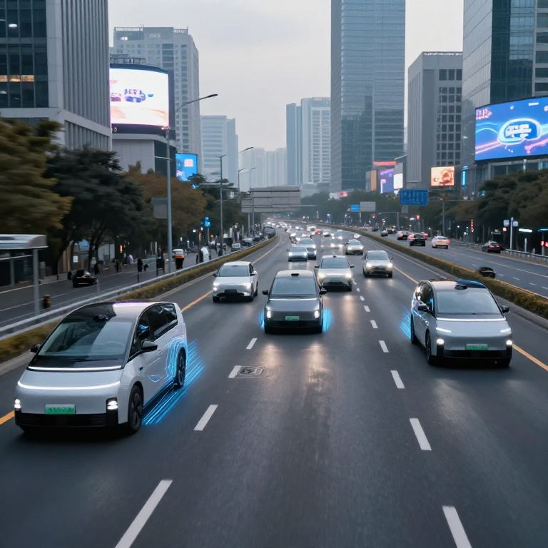 Photograph of a busy urban street with electric vehicles, LED-lit cars, tall skyscrapers, and illuminated billboards in a modern cityscape