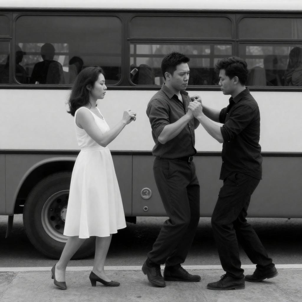 Black and white photograph of three people outdoors. Woman in patterned dress and white shoes stands in center, looking right. Man in dark suit and tie stands left, looking down. Man in light shirt and dark pants sits right, reclining in chair, looking at woman. House with open door and windows in background. Woman has short hair, earrings. Man in chair has short hair, relaxed posture. Sunlight casts shadows on grass.