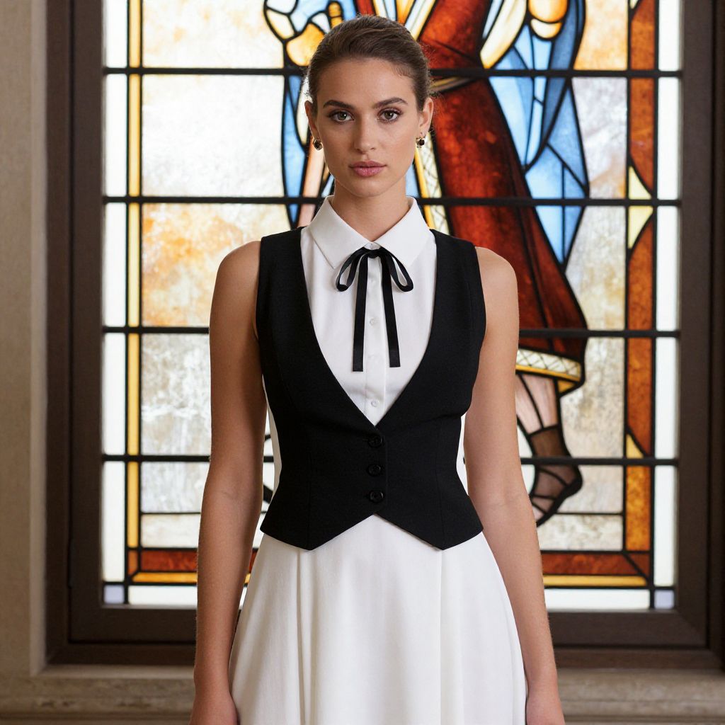 Female model wearing a white dress with a black vest over it. The dress has a white collar with a white ribbon and a black ribbon around the neck. The woman has her hair pulled back in a bun and is wearing earrings on her ears. She is standing in front of a stained glass window.