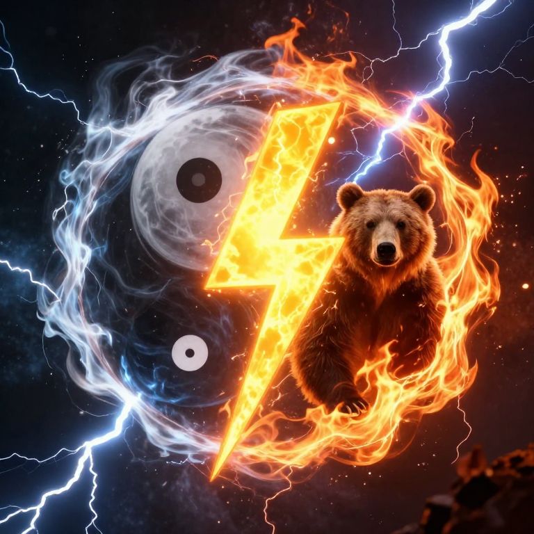 Hypnotic, attractive, lightning bolt symbol, twirling flames, charged lightning, taiji, dichotomy, duality, fire and lightning, a yellow lightning bolt glyph surrounded by the primal forces of chaos at the birth of the universe, giving birth to yin and yang, coldness of winter water, warth of summer fire, light and shadow, a grizzly bear is the lord of chaos the emperor of all realms who oversees creation and harnesses powers of buzz duality, epic, cinematic, dramatic, chinese buddhist daoist vibes, feral majesty, lightning as the destructive force of death, lightning as the rebirthing force of life