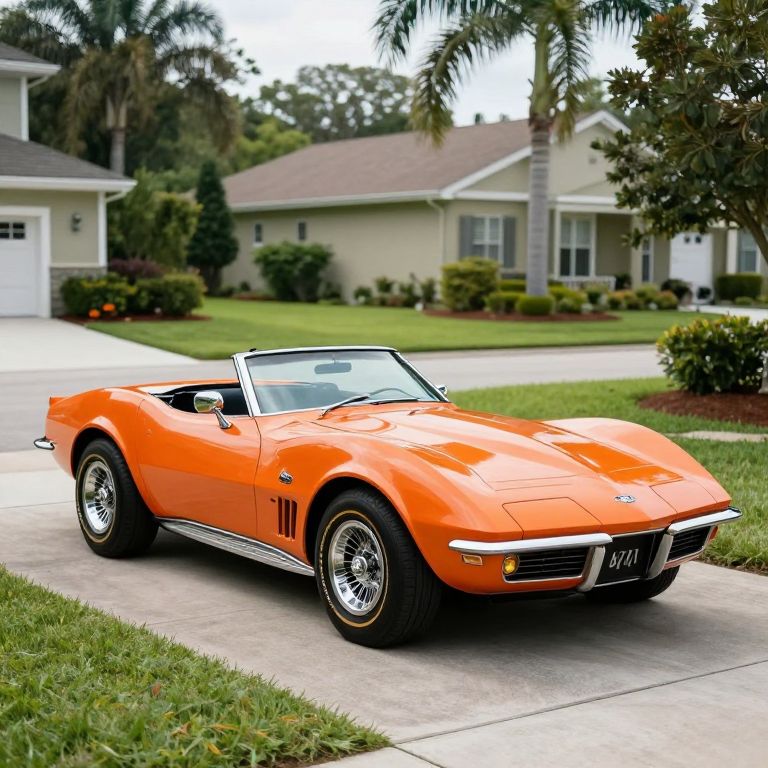 Vibrant orange 1969 Chevrolet Corvette convertible parked gracefully in a suburban driveway, showcasing its classic design and polished exterior against a backdrop of manicured greenery and residential structures in Maitland, Florida.