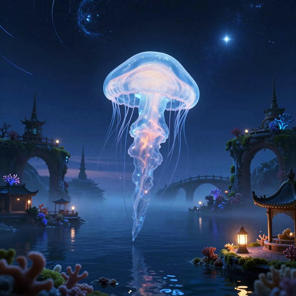 A gigantic moonlit jellyfish drifting silently set within twilight seascape with bioluminescent reefs and coral arches, wrapped in ethereal mist and drifting incense, glowing stars scattered above, a celestial vault painted with deep azure gradients with glowing phosphorescent trails. Tranquil waters mirror the heavens, distant spires and bridges on rocky arches, lantern-lit sanctuaries and mossy terraces, a serene dreamlike atmosphere with surreal, intricate details; cinematic composition, volumetric fog and light rays, hyper-detailed textures, high dynamic range, wide-angle vista, depth of field, soft rim light, subtle film grain, epic scale.