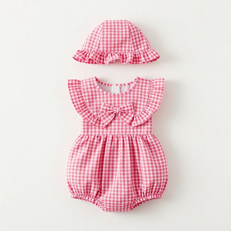 Adorable Girls Bubble Romper with Matching Hat, Gingham Fabric with Matching Frills and Bow Detail on Bib and Hat.