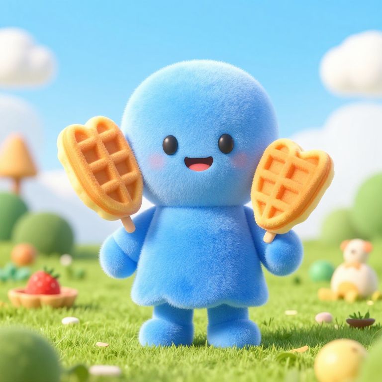 Velvety a 3d grand ma character in nature, small, holding a waffle character, realistic, with a blue dress, , which will be the mascot of a advertising campagne for a waffle brand.,