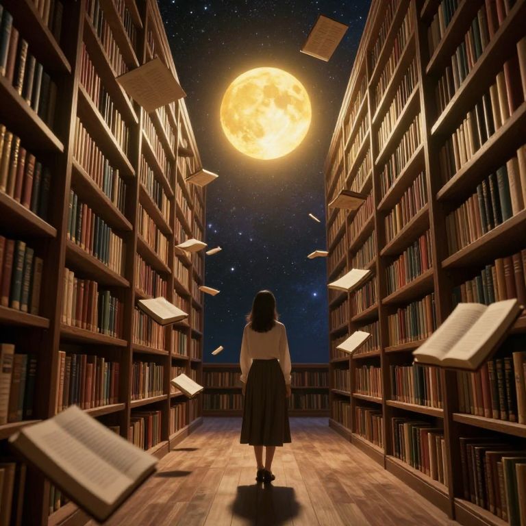 Photograph-like digital art: A woman with long dark hair, white blouse, and black skirt walks down a moonlit library aisle, surrounded by flying