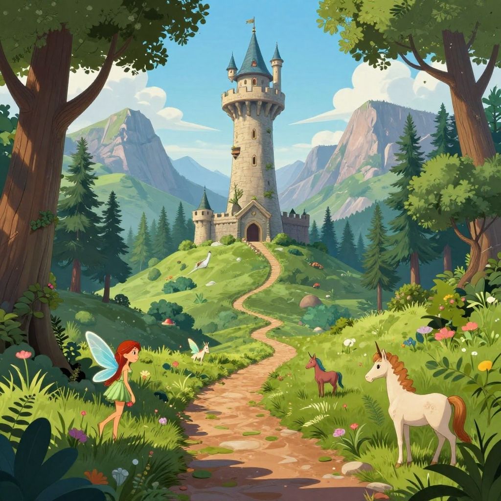 A semi realistic image of a wizard's tower with a trail leading to it through hills and mountains. Faeries, unicorns, and living trees bring the forested trail to life with color and vitality