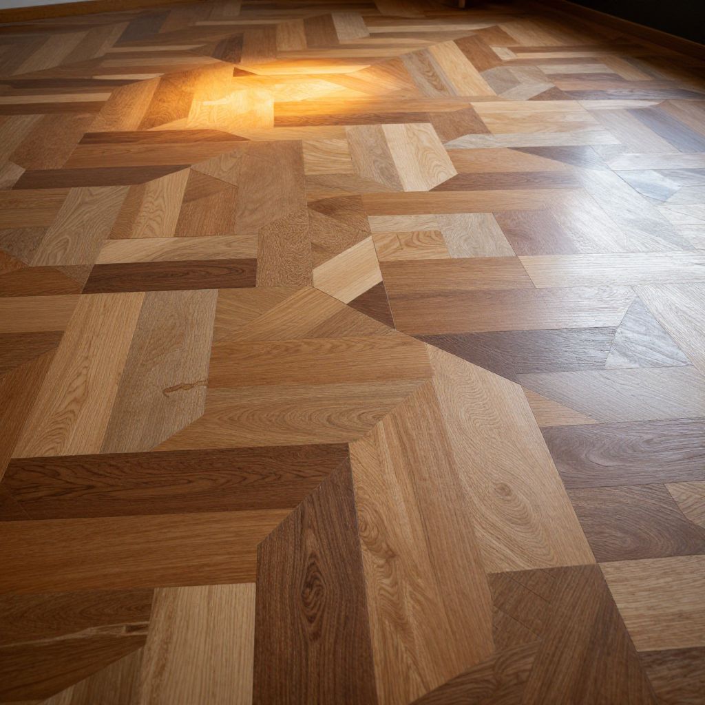 Floorboard mosaic pattern made of different wood species, geometric shapes in natural wood colors, intricate craftsmanship under warm spotlight, polished surface reflecting ambient light, artistic and elegant interior design element.