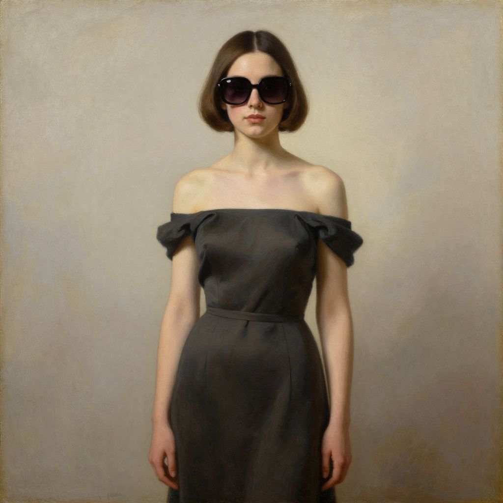 A hyperrealistic oil painting of a sophisticated young woman with a perfect face and proportions, wearing a long shoulder-less elegant dress, futuristic large oversized sunglasses, and a bob hairstyle, reminiscent of the Dutch masters' style from the 18th century.
