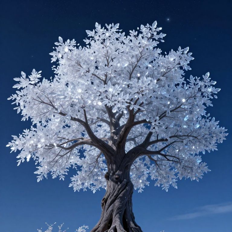 An enchanting dreamscape emerges with surrealistic flair, showcasing an imposing tree adorned with luminous crystal leaves against a captivating starlit sky. From an intriguing perspective reminiscent of a 'bug's-eye view', the scene invites us to marvel at the tree's celestial beauty, evoking a harmonious blend of serenity and subtle unease that mirrors the complex nature of dreams.