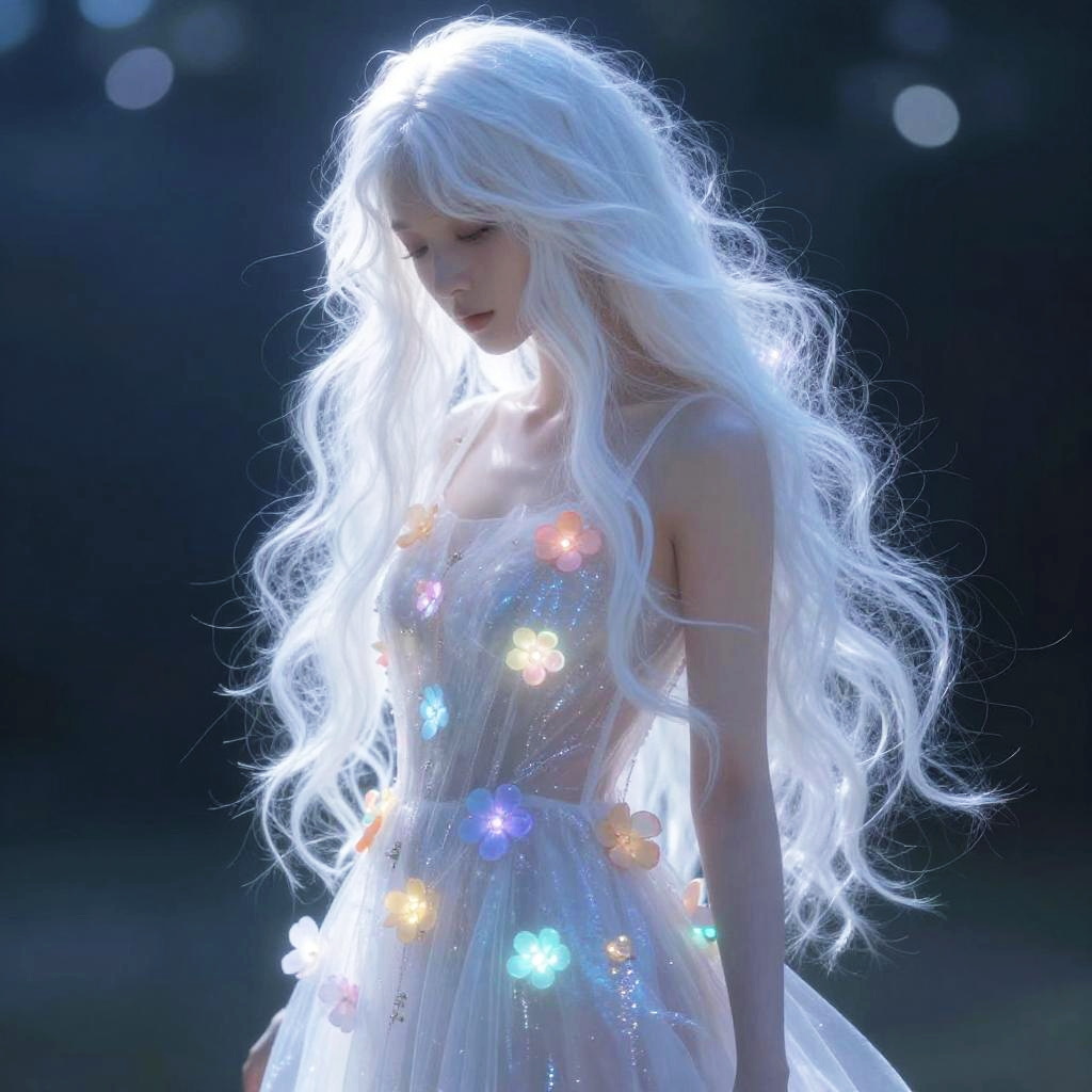 This is a digital art piece featuring a slender, ethereal woman with long, flowing white hair. She's wearing a translucent, shimmering dress adorned with glowing, colorful flowers. Her face is partially obscured by her hair, and she's bathed in soft, magical light. The background is a dreamy, dark blue with bokeh-like lights, adding to the fantasy vibe. The overall style is whimsical and otherworldly.