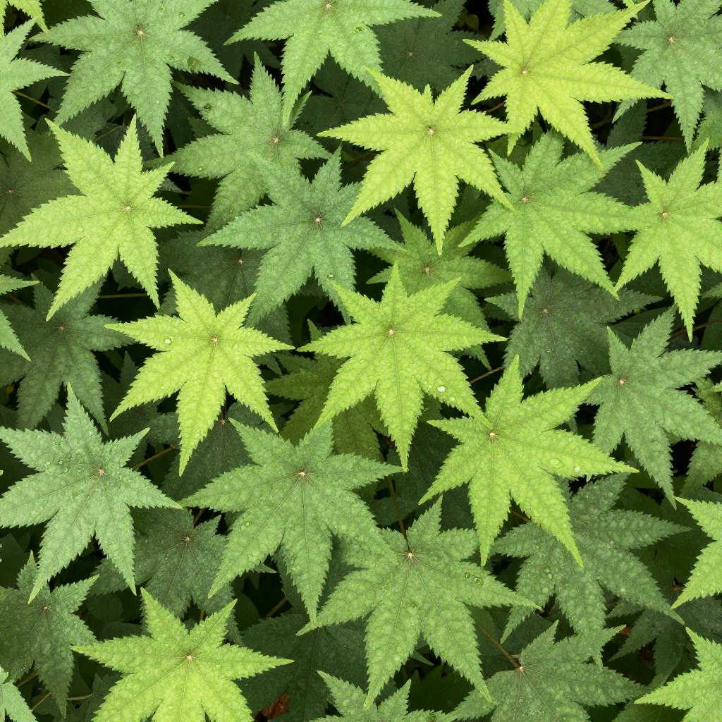 Photograph of a vibrant green cannabis plant with serrated, star-shaped leaves. The leaves are detailed with visible veins and a slightly glossy texture. The plant is surrounded by similar green foliage, creating a dense, lush background. The image has a bright, natural light, highlighting the plant's fresh and healthy appearance. The overall scene looks like it's taken outdoors in a garden or natural setting.