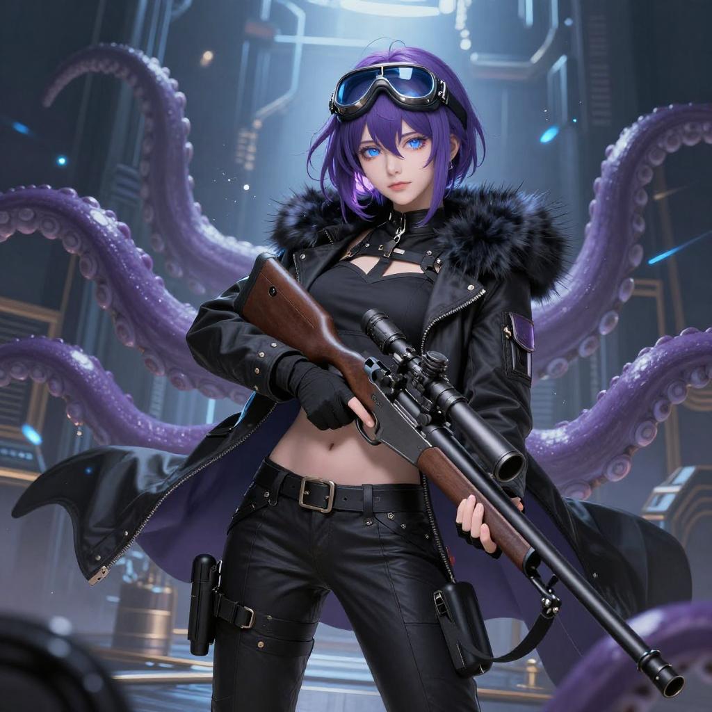 Digital illustration of a female character from Arknights with short purple hair and blue eyes, wearing black goggles on her head. She is dressed in a black fur-trimmed open jacket, black shirt, and black pants. The character is holding a sniper rifle and surrounded by large purple tentacles in a dynamic, sci-fi setting with blue lighting effects.