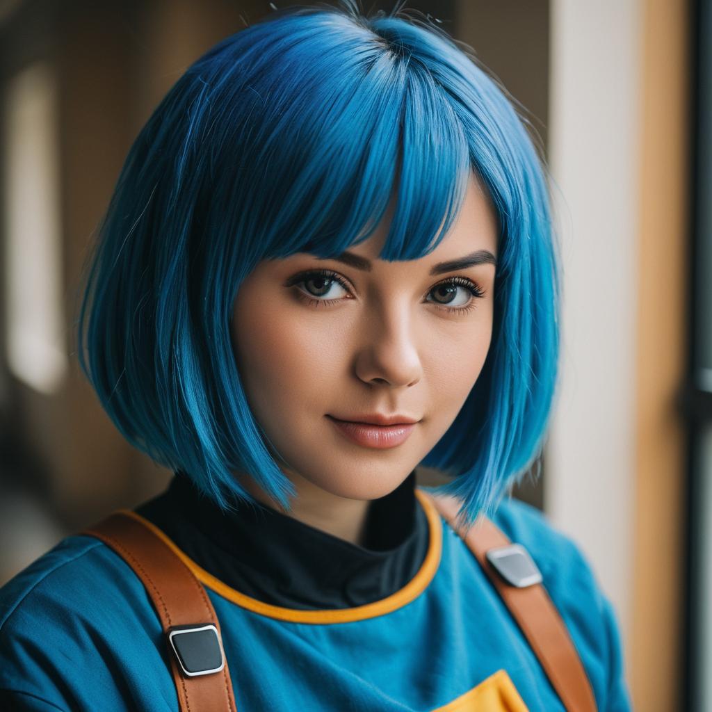 Close-up portrait of a young woman with short blue hair, wearing black-framed glasses and a purple bow headband. She is dressed in a black shirt and a matching purple bow tie, posing against a soft, neutral background. The photo features natural lighting and vibrant colors with a shallow depth of field.
