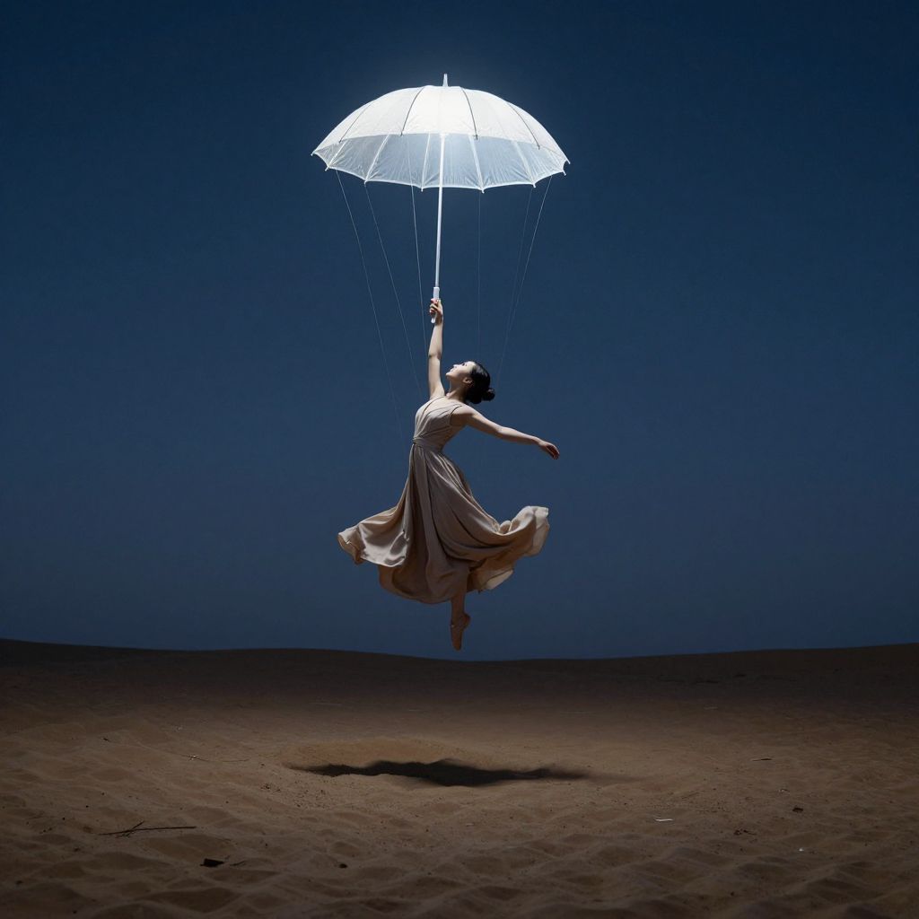 A luminous, sentient parasol hovers gracefully over a desolate desert, its strings delicately guiding a woman in flowing attire as she stands suspended between earth and sky, defying gravity in a surreal nocturnal ballet.