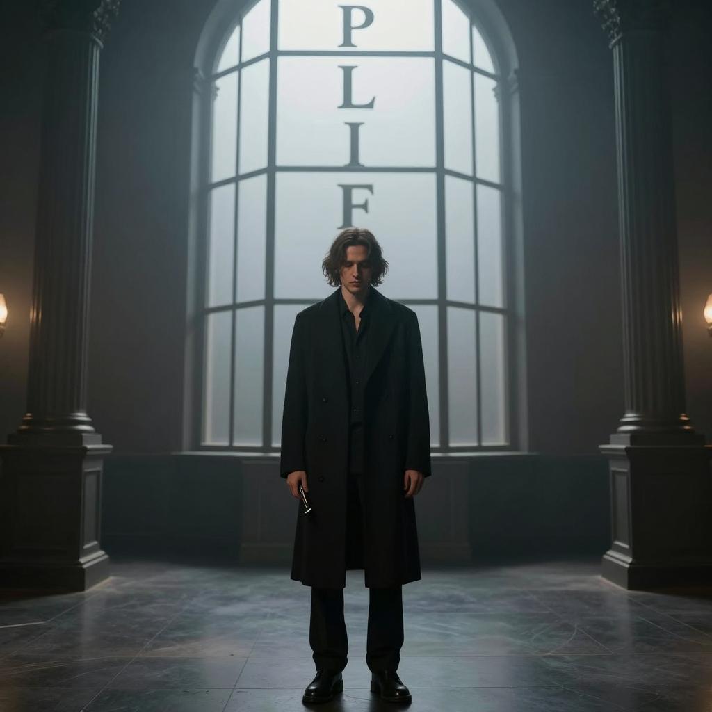 A man with shoulder-length brown hair stands in the center of a dimly lit, foggy room. He wears a long black coat and holds a small object in his right hand. Behind him is a tall, glass-paned structure with letters "P L I F F" vertically aligned. Two dark, decorative posts are on either side. The man's face is slightly tilted downward with a neutral expression. One other person is not visible.