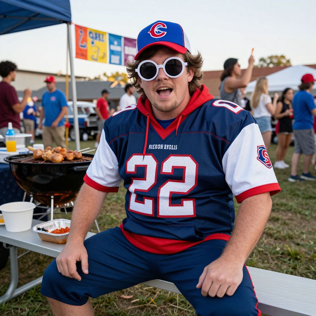 A vibrant, candid photo of a man in a detailed football game day outfit and costume, complete with a vintage-style home team hoodie, football-shaped sunglasses, and a red-and-blue baseball cap with team logos, sitting on a outdoor bench at a high school football tailgate event, his face showing enthusiasm and a relaxed expression, with a background of grilled food, banners, and cheering fans in a lively summer evening setting.
