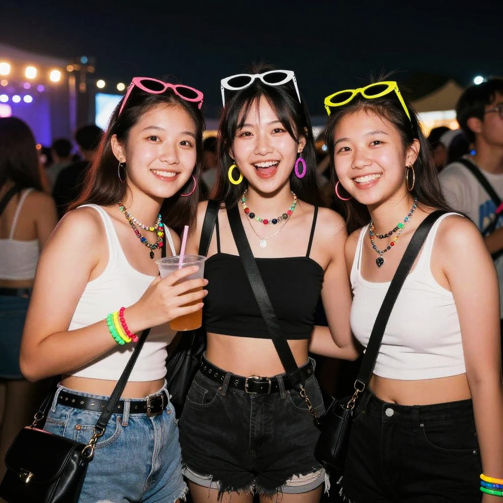 Crossdresser teens celebrating at a music festival, eclectic fashion styles, neon accents, lively crowd, expressive faces, vibrant night lights, energetic and fun