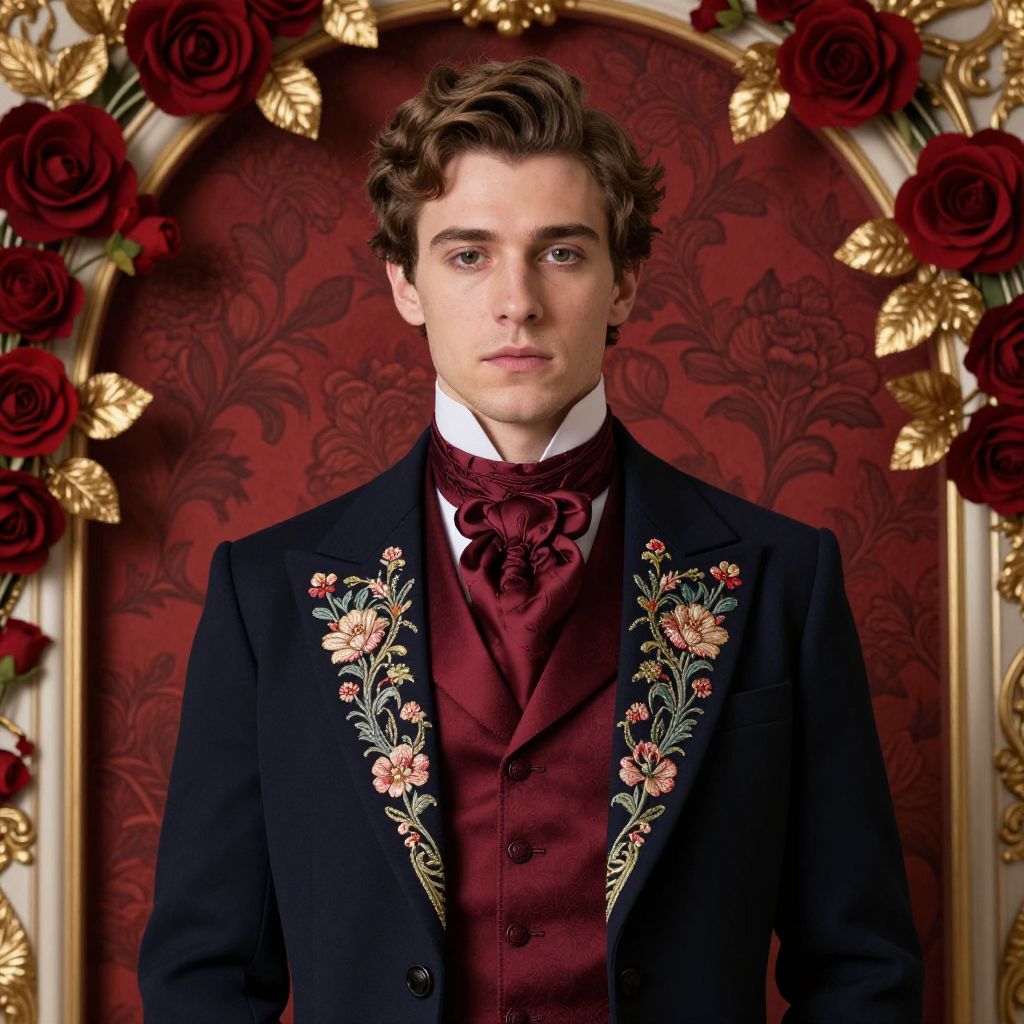 Portrait of a young man wearing an elegant Victorian style suit with intricate floral embroidery on the lapels, a deep red cravat, and a matching waistcoat. The background features a red floral pattern framed by an ornate arch adorned with red roses and golden leaves.