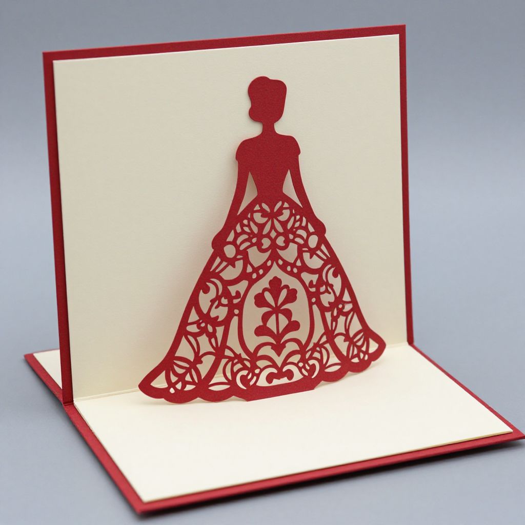 A beautifully crafted 3D pop-up wedding invitation card features a laser-cut silhouette of a woman in an elegant gown, showcasing intricate floral patterns and a sophisticated design against a creamy background with bold red accents, exemplifying top-grade craftsmanship and artistic detail.