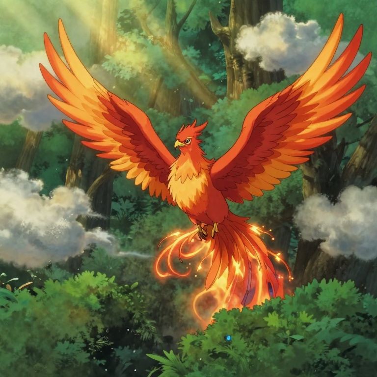 A surreal digital art scene captures the essence of Studio Ghibli's imaginative world with a whimsical dusk setting. A majestic phoenix with vibrant iridescent feathers soars above an ancient forest, its ethereal glow casting golden hues on intricate tree patterns below. This dreamlike narrative masterfully blends detailed natural elements and fantastical creatures, evoking wonder and melancholy in harmony.