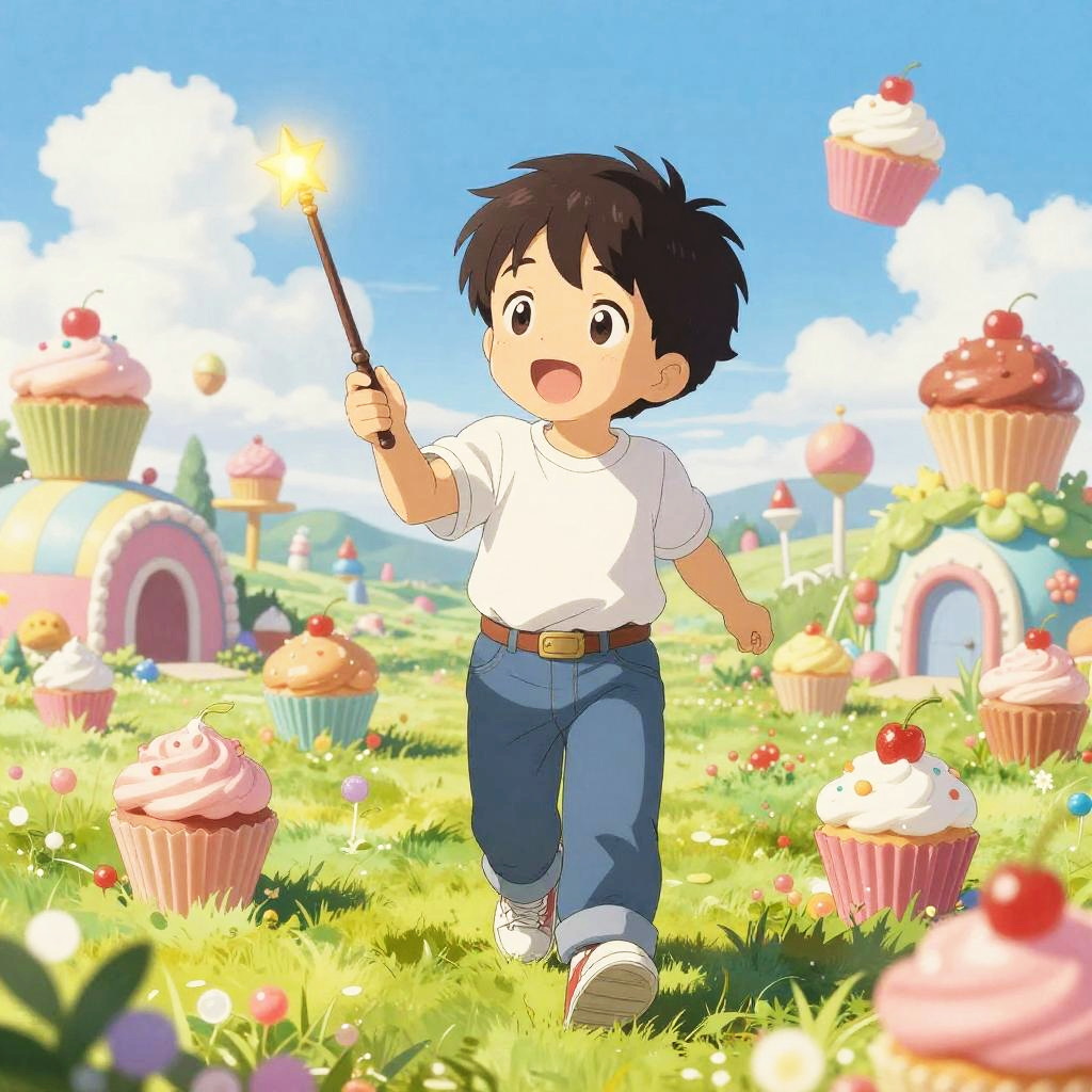 Realistic photo.a little boy, holding a magic wand, walking through a whimsical candy land, surrounded by floating cupcakes, depicted in the nostalgic and detailed manga style of Shinji Nagashima. realistic photo
