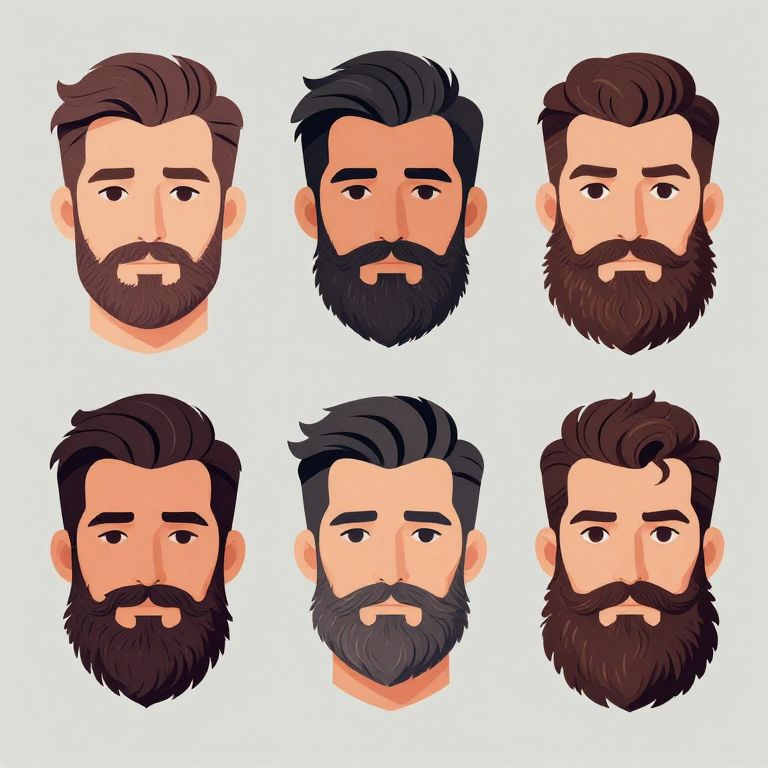 Digital illustration of six bearded men's faces in a grid, each with different dark brown to black hair and beards, on a white background.