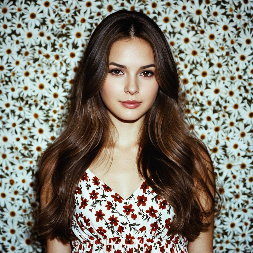 Floral going out dress,1girl, solo, dress, long hair, floral print, realistic, brown hair, flower, brown eyes