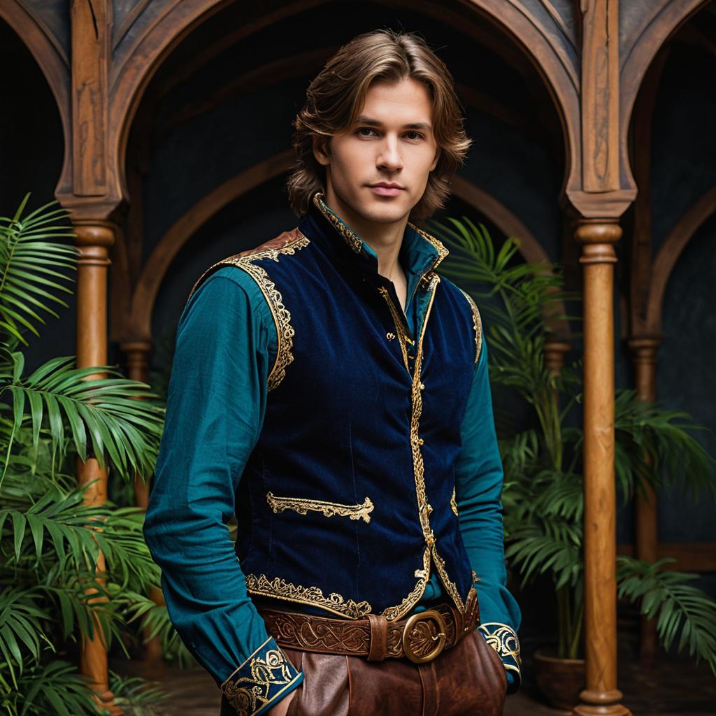 Photorealistic portrait of a handsome young man wearing a Victorian-inspired fantasy outfit. He is dressed in a dark blue long-sleeve shirt with intricate gold embroidery, a brown leather vest with matching gold details, and brown pants featuring a decorative leather belt. The man has medium brown hair styled up and displays a serious expression. The background consists of wooden arches and green plants, illuminated by soft, realistic lighting in a studio-like atmosphere.