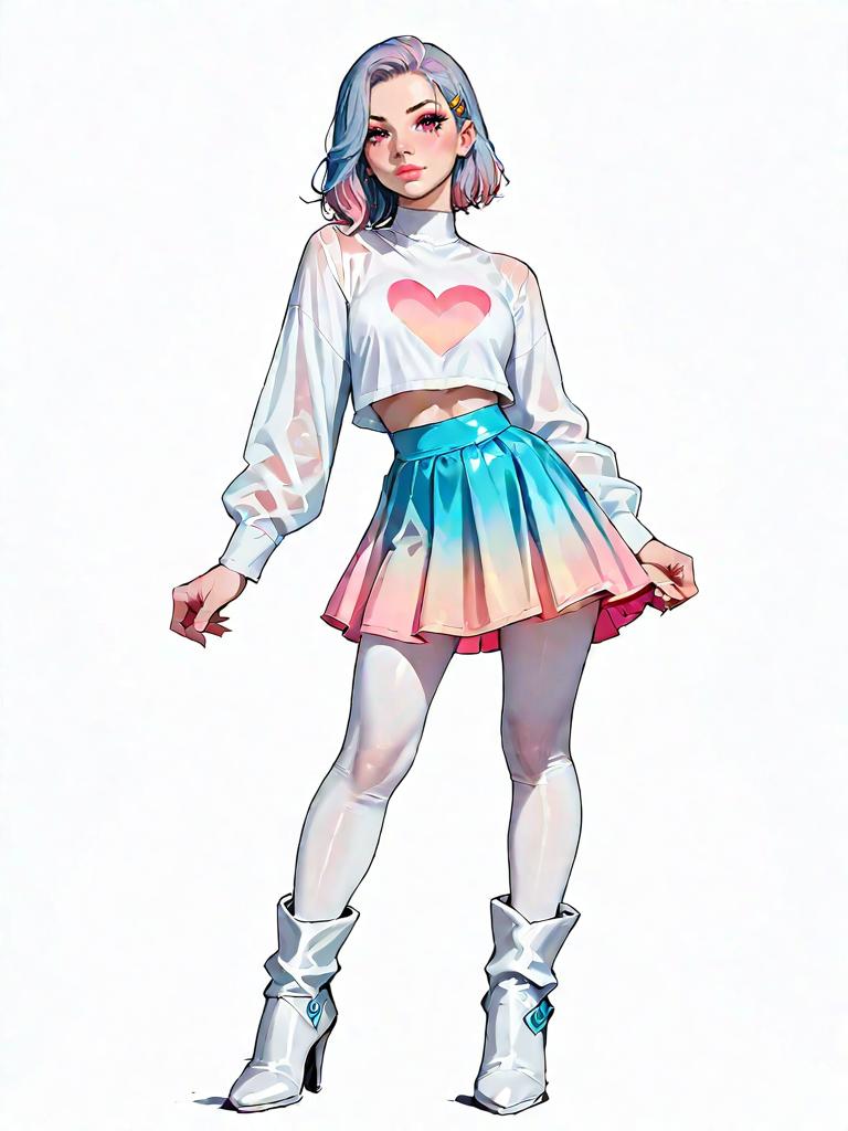 1girl, source_comics, realistic face, full body shot, Woman, modern chic, color-blocked bodycon mini dress with long sleeves, hot pink top and high-neck, translucent sheer midriff, pastel lilac skirt, white opaque tights, clear high-heeled ankle boots, white background.