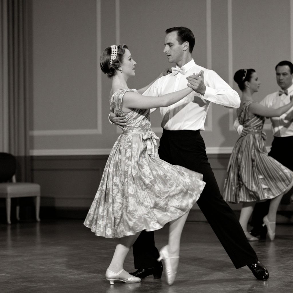 Elegant dancers perform a poised routine in a classic mid-century setting, with the woman wearing a flowing dress and headband, while the man in a crisp shirt and bow tie gently guides her movements.
