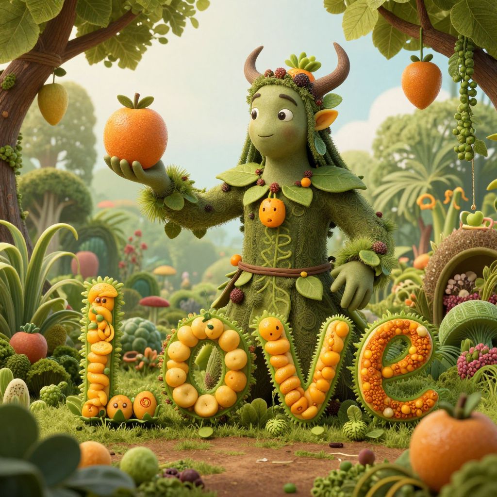 A half-human, half-plant guardian tends an impossible garden where fruits grow words instead of seeds.
