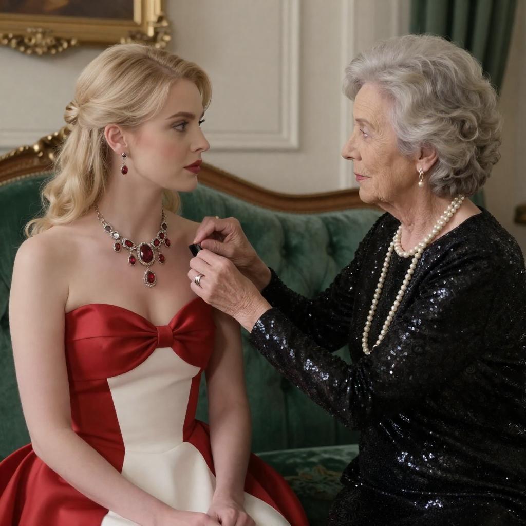 Two women in period costumes, smiling at each other. Young woman with curly brown hair, off-shoulder red dress, holding a red bow. Older woman with curly brown hair, red patterned robe, holding a white cloth to her face. Indoor setting with warm lighting. Older woman touches her cheek with her fingers. Both women have warm expressions.