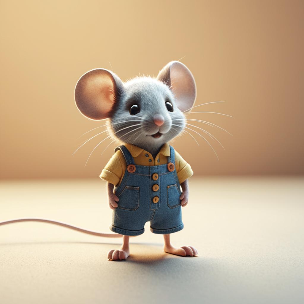 3D render of a small, anthropomorphic mouse character standing on an open book while reading a smaller book. The mouse wears an orange coat and gray pants, illuminated by gentle morning light in a warm, earthy interior setting with stacks of books in the background. Styled in a whimsical, Hayao Miyazaki-inspired design with detailed fur and expressive eyes.