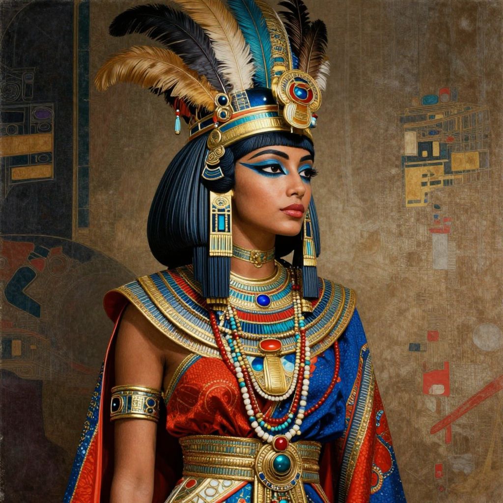 The image depicts a highly detailed and vibrant artwork of a woman in ancient Egyptian attire, blending African and Japanese influences. She is adorned with an elaborate headdress featuring feathers and intricate gold patterns, complemented by a richly textured, multi-layered outfit in shades of blue, red, and gold. The woman's face is accentuated with striking makeup, and she wears a variety of necklaces and bracelets, each meticulously crafted with beads and gemstones. The background is a muted, earthy tone with abstract shapes, creating a striking contrast with the vivid colors of the woman's attire. The overall composition is dynamic, with the woman positioned centrally, her gaze directed slightly to the side, exuding a sense of regality and mystery. The artwork is reminiscent of ukiyo-e style, with a touch of fantasy and sci-fi elements, blending traditional and futuristic aesthetics.