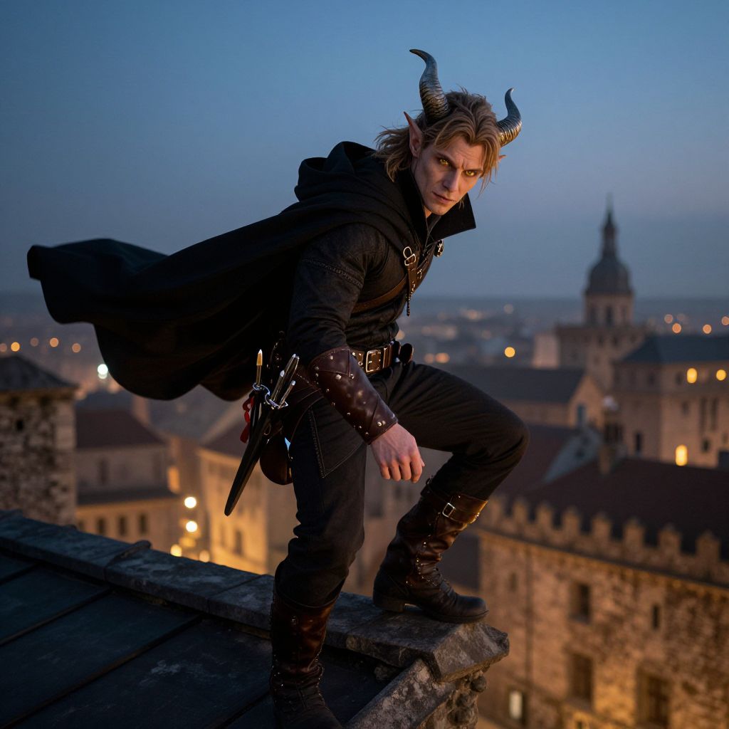 Tiefling DnD male rogue perched on a rooftop over a medieval city, sharp yellow eyes glinting, sly expression, dark cloak billowing in the wind, leather gear with hidden weapons, horns twisted elegantly, twilight setting with warm city lights, dynamic pose