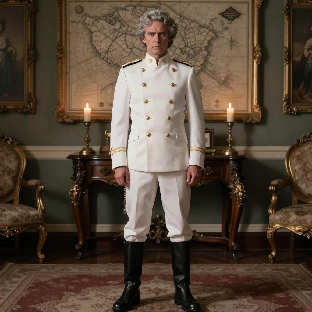 Photograph of a stern-looking man with gray, curly hair standing in an opulent, dimly-lit room. He's wearing a white military-style uniform with gold buttons, black boots, and holding a chain in his right hand. The background features ornate wooden furniture, a lit candle on a side table, and a large, detailed map on the wall. The room has a vintage, regal vibe.