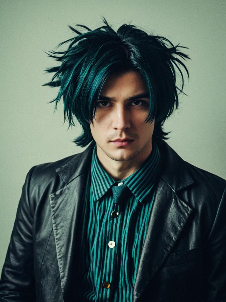 Man in Edgar Cut Hairstyle costume, cosplay editorial photography, realistic tones