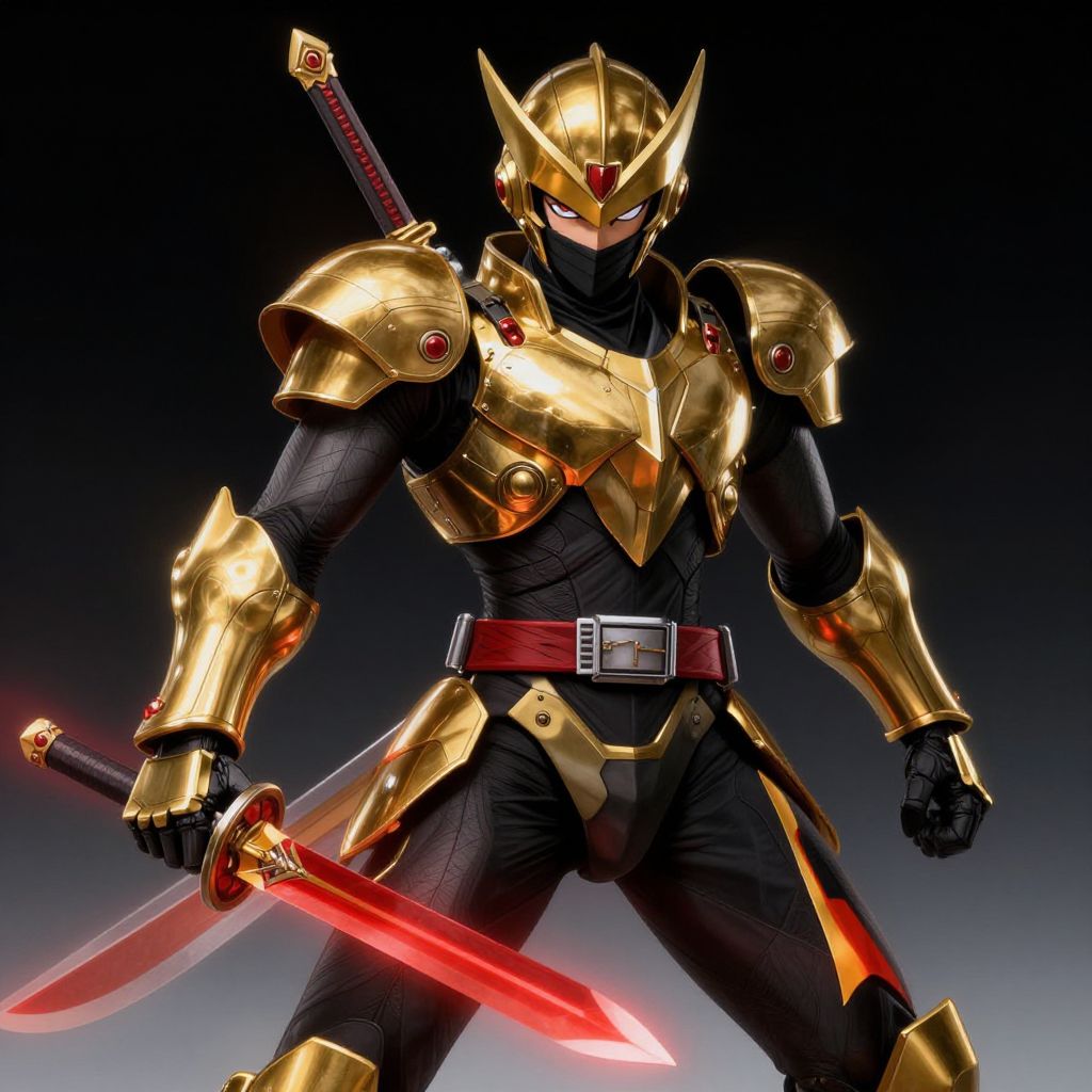 Digital illustration of a muscular, armored warrior in a dynamic pose. He wears black, form-fitting bodysuit with gold, metallic armor plates covering his chest, shoulders, and arms. His helmet has sharp, pointed ears and a red gem at the center. His eyes glow red, adding a menacing look. A red, glowing sword is held in his right hand, while a sheathed sword is strapped to his back. The background is a gradient from black to gray, highlighting the character's imposing figure. The armor has red accents and a black belt with a silver buckle. The overall style is reminiscent of Japanese mecha or superhero designs.