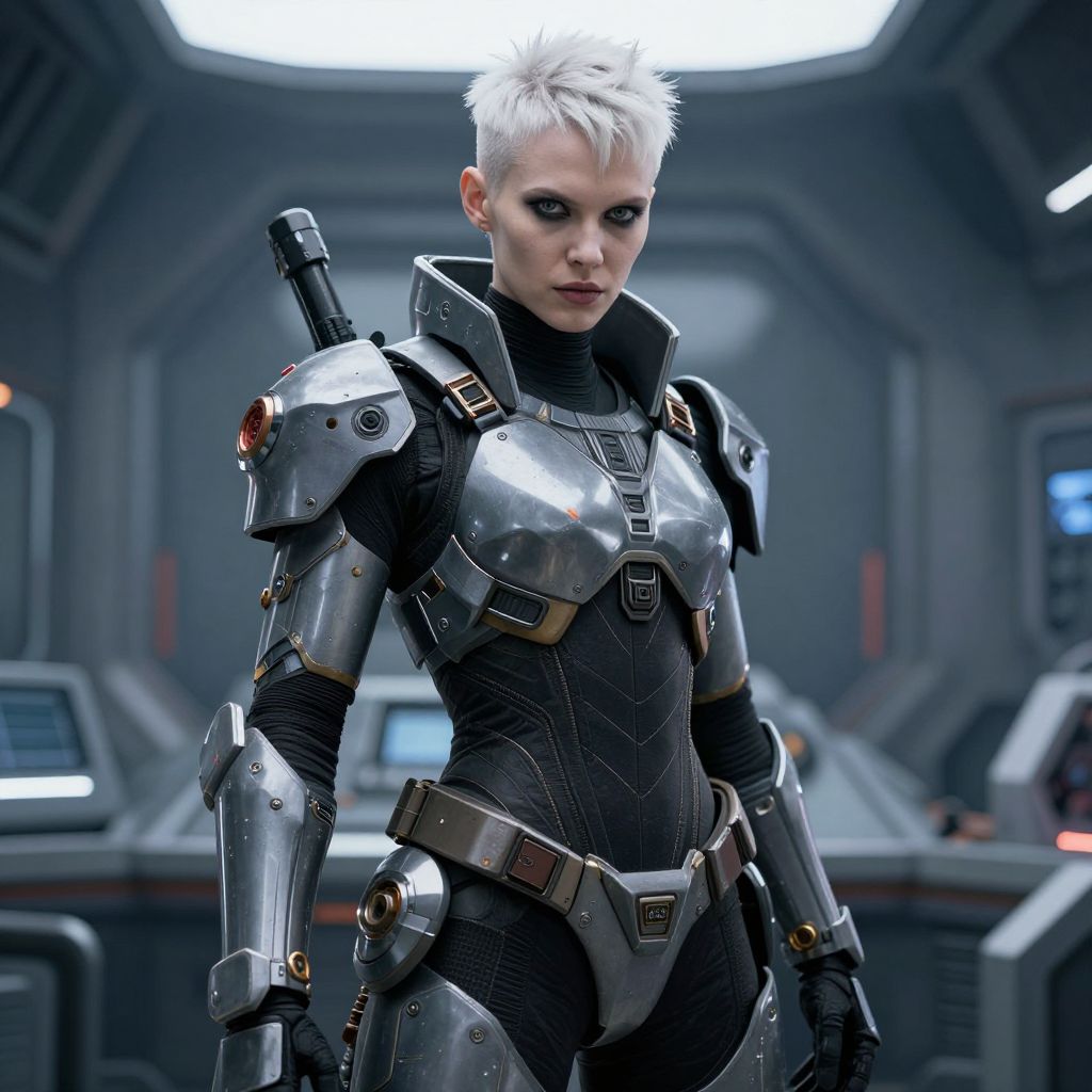 A highly detailed CGI image of a white-haired, fair-skinned woman with a stern expression, standing in a futuristic, dimly lit spaceship interior. She wears metallic, silver armor with black accents, including shoulder pauldrons and a chest plate, and a black, form-fitting bodysuit underneath. Her hair is short and spiky, and her eyes are dark. A gun is strapped to her back. The background features sleek, gray control panels and a circular, illuminated ceiling. The overall style is sci-fi, with a focus on realistic textures and metallic finishes.