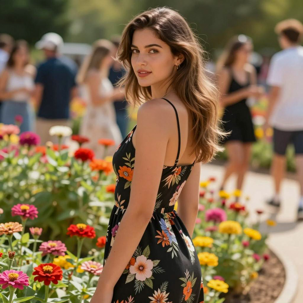 Dance dancewear, photograph of a young blonde woman, ponytail, orange lace tank top, black high-waisted pants with black tie, standing in a vibrant flower garden, colorful flowers, sunny day, side view, looking over shoulder, green foliage, blurred background, summer, natural light